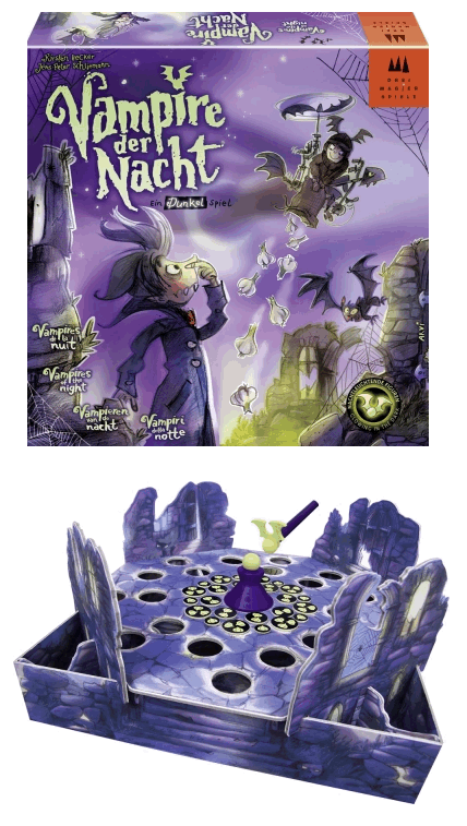 Vampires de la Nuit est un jeu pour enfants avec à la fois des aimants et des pièces phosphorescentes pour jouer dans le noir, c’est vous dire à quel point je ne pouvais pas le rater. Le design est classique pour Drei Magier Spiele avec des très mignons vampires, qu’il va s’agir de protéger contre une pluie de gousses d’ail envoyée par un méchant chasseur de vampires. La boite sert de plateau, avec un plancher de château plein de trous. Sur ce plateau, on dispose des pions ronds phosphorescentes représentant des gousses d’ail. Et on éteint la lumière : on voit donc les gousses mais plus les trous du plancher. Et il va falloir sortir les gousses du plateau en les poussant avec un gros pion en plastique, mais sans les faire tomber dans les trous, ou en tout cas pas trop. Dernier détail, on ne déplace pas le gros pion avec les doigts, car il est aimanté, mais en le repoussant avec une petite baguette aimantée à l’inverse, et décorée d’une très jolie chauve-souris. Le contrôle sur le mouvement est donc incertain mais on s’y fait assez vite tant qu’on prends son temps. Au-delà de l’aspect magique du jeu dans le noir, qui est cependant un argument important, on obtient un petit jeu d’adresse qui fonctionne bien, sans être exceptionnel, avec une petite dimension tactique qui fonctionnera sans doute assez bien avec des enfants pas trop jeunes.