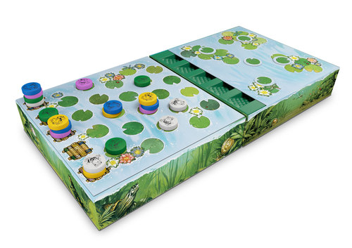 Water Lily est un jeu malin, destiné aux enfants mais pas que, et très joliment édité. Pour l’édition, c’est chez Gameworks, donc c’est soigné jusque dans les petits détails, sobre et élégant et ça donne envie. En plus, j’aime bien les illustrations. Pour le jeu, c’est très bien aussi. Il s’agit d’une course de grenouilles, sautant de nénuphar en nénuphar avant de plonger sous la surface de la mare. Plouf donc. Le plateau de jeu se mettant sur le couvercle, et la boite servant de mare dans laquelle on plonge, plouf donc. La partie dans laquelle on plonge est dissimulée, puisque l’important, c’est l’ordre d’arrivée des grenouilles dans chaque ligne, qui n’est révélée qu’à la fin avec la couleur de chaque joueur. C’est beau, et ça marche puisque la partie course est tactique avec des règles très simple, et toute tournée vers le devinage de qui joue quelle couleur, le bluff pour faire croire que et le sabordage de couleurs pour voir si quelqu’un réagit. De quoi, en fait, jouer gaiement avec des enfants, ou entre enfants, tant les règles sont simples, mais tout autant entre adultes, et ça devient alors retors et très tactique (et rapide), ou les deux mélangés. Non, vraiment, je cherche, mais je n’ai que du bien à en dire. A ranger dans votre ludothèque enfanto-compatible (mais pas que) dans la catégorie tactique astucieuse et petit bluff.