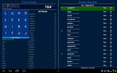 Les jeux les plus simples sont parfois les meilleurs, en tout cas en ce qui me concerne. Et si je joue sur tablette, j’ai globalement du mal à y trouver des jeux vraiment entousiasmants au-delà du temps de découverte. Mais là, je dois avouer y passer des heures. Et pourtant, comme je le disais, on ne fait pas beaucoup plus simple. Si vous avez déjà joué au Boggle, vous y retrrouverez vos marques en moins de deux, puisque c’est bien de ça qu’il s’agit : trouver des mots dans une grille de 4X4, le plus possible, en temps limité (144 secondes, ne me demandez pas pourquoi par contre). Et l’intérêt de la tablette est de faire ça en ligne avec tout plein de gens qui font le même tableau en même temps, avec classement à la fin et tout. Et ça fonctionne grave : parties courtes, peu d’attente, et des tableaux qui changent à chaque fois, et la liste des mots possibles donnée après pour se lamenter de ceux qu’on a raté. De plus, l’ergonomie est bonne et c’est un fonctionnement particulièrement adapté à l’écran tactile. Par contre, seul inconvénient à ce jour, il est en anglais.