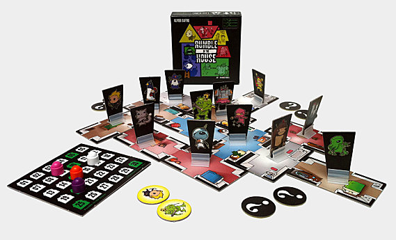 Rumble in the house est un tout petit jeu, simple et rigolo, qui mérite d’y jeter un oeil pour des petits moments d’apéro ou d’interstices ludiques, avec n’importe quel public. Le principe est tout simple : une maison, composée de pièces et assemblées pour chaque partie (mais ça ne change pas grand chose en terme de fonctionnement ludique) et une douzaine d’habitants, soit des pions illustrés. D’ailleurs, les illustrations sont très jolies et très débiles, ce qui participent très largement à l’ambiance du jeu et sa réussite. Car le principe est simplement à son tour de déplacer un pion vers une autre pièce ou de faire combattre deux pions présents dans la même pièce. Et le combat est simple : le joueur décide simplement qui gagne et qui est éliminé : Cthulhu contre l’elfe des bois, le ninja rose contre les loutres commando, le pingouin terroriste contre le golem radioactif, etc. Chaque joueur ayant deux personnages, secrets, qui lui sont propres, chacun gagnera des points selon le temps qu’aura duré son meilleur personnage. C’est tout simple, très rapide donc et franchement rigolo pour peu qu’on veuille juste s’amuser un moment sans se prendre la tête et en racontant des conneries tout en bluffant doucement.
