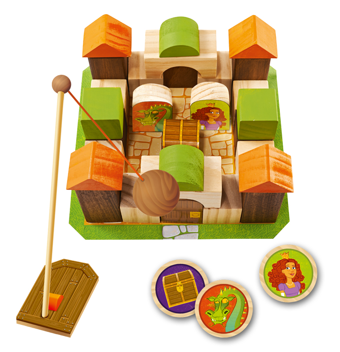 Paf Muraille, c’est très bête. Paf Muraille, c’est très simple. Et Paf Muraille, c’est très drôle. Comme principe, on ne fait pas beaucoup plus évident : il faut détruire un chateau (constitué de cubes en bois) en faisant balancer une grosse boule, également en bois. Voilà. En tout cas, dans la version de base, ça ne va pas beaucoup plus loin. Mais ça satisfera déjà largement les plus jeunes. Avec les règles dites avancées, on rajoute un poil plus de tactique et de mesquinerie et ça fonctionne tout à fait bien. Bon, ça reste simple, et on y jouera pas non plus des heures, mais c’est un plaisir dont il serait dommage de se priver. Ne l’achetez pas si vous n’avez pas d’enfants preneurs de ce genre de choses ou d’occasion de l’utiliser en animation, mais prenez le temps de le tester si vous avez l’occasion. Enfin, si vous aimez les jeux bêtes, mais c’est complètement mon cas…