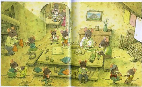 La famille souris, c’est une collection de livres illustrés, destinés aux tout-petits mais pas du tout dans un style simple et coloré. Au contraire, les illustrations sont riches et fines, pleines de détails et surtout très naturalistes. De fait, on suit la vie d’une grande famille de souris dans le Japon rural. Et à hauteur de souris, on profite bien de la flore et de la micro-faune. Même si ça peut passer inaperçu, c’est en fait très japonais : d’abord par cette nature très présente et traitée comme un personnage ; ensuite par le mode de vie de la famille, ses activités et ses accessoires. Le lien à la nature, ça doit marcher pour tou-tes, le côté japonais est plus spécifique et pas du tout vital. Dans chaque volume, la famille souris se lance dans une activité de saison : faire pousser un potiron, préparer un petit-déjeuner de framboises, fabriquer luges et jeux d’hiver et même organiser la cérémonie d’hommage à la Lune (ok, en français, ça donne : dîner au clair de Lune, on y perd un peu). Il ne se passe rien d’aventureux ou d’imprévu, mais il y a à chaque fois plein d’activité. Et de détails à observer, en particulier sur la nature. A lire avec une enfant, c’est paisible et joli, et prenant parce que c’est la vie de la famille, tout de même. Et c’est beau, à tout âge.