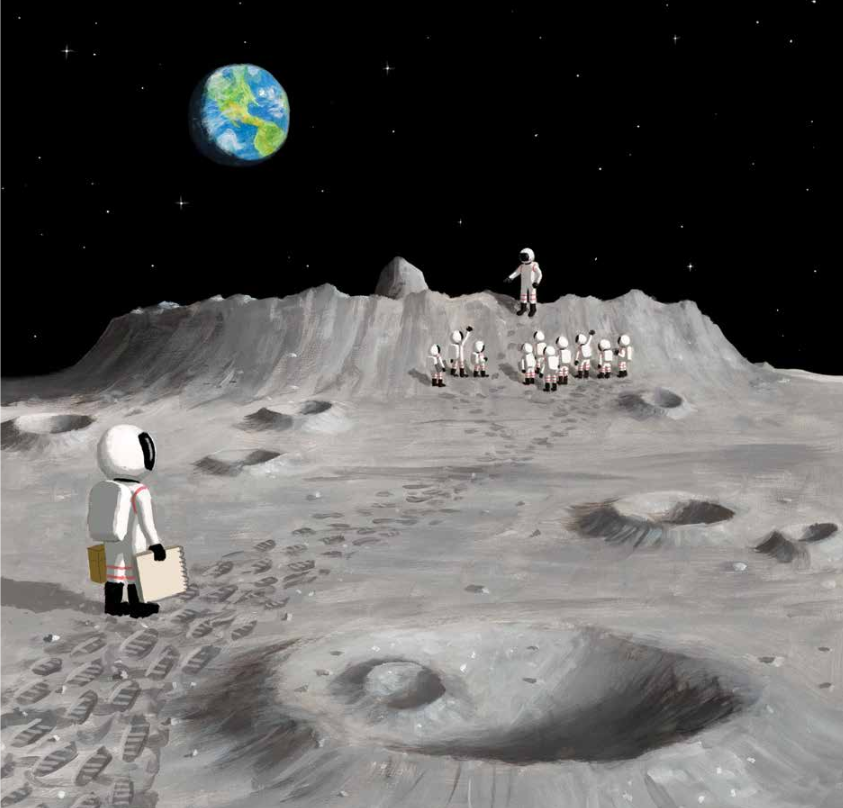Les conseils des libraires, quand même, c’est précieux. La demande était : un livre sur l’espace, la Lune, les étoiles. Et c’est donc l’histoire d’un voyage de classe sur la Lune, avec un-e petit-e enfant rêveur-se et aimant dessiner qui va s’y retrouver oublié-e (mais pas longtemps, hein). C’est d’abord une jolie histoire poétique. Mais c’est aussi et surtout une réussite graphique, parce que c’est beau et parce que c’est un livre sans aucun texte, et où les illustrations parviennent à tout raconter. Même la couverture et les pages de garde font partie de l’histoire. Et outre que ça me plait, ça plait aussi à Olympe, aussi bien pour l’espace, que pour le fait de raconter elle à partir des images et que pour l’histoire elle-même (parce que oui, elle aimerait vraiment bien qu’on la laisse un moment toute seule sur la Lune).