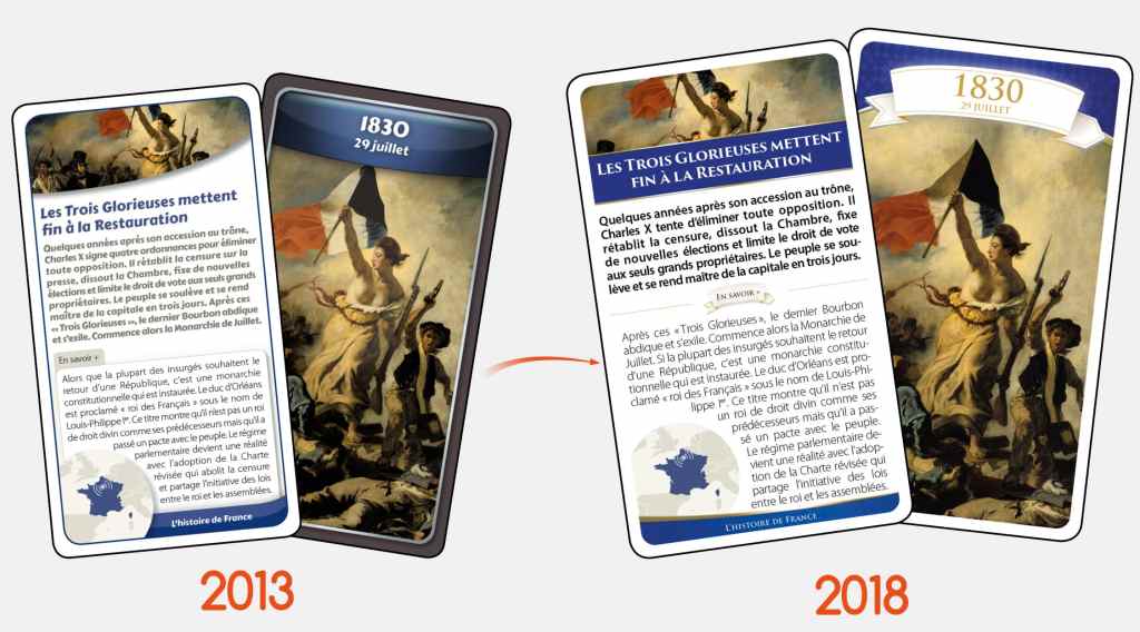 Chronicards existait depuis aussi longtemps que Timeline, et c’est presque exactement le même jeu : si ce n’est que le parti pris est résolument scolaire, notamment sur la quantité de contenu présent sur chaque carte et du coup le style graphique chargé au point d’être rébarbatif. Chroni est la nouvelle version de chronicards, et seul le visuel change mais c’est une bonne nouvelle : plus clair, un peu plus aéré et nettement moins rébarbatif, tout en gardant beaucoup de contenu. Bon, les illustrations sont globalement belles et tirées de grandes œuvres mais il y a quelques exceptions de type cartoon que je trouve un peu dommage. Maintenant, ce sont de grandes cartes, ce qui est agréable.. Et par rapport à Timeline, il y a des boites à thème bienvenues notamment femmes célèbres. À préférer à Timeline si vous êtes frustré-es sans contenus et réponses pour chaque carte ou pour des finalités solaires ou parascolaires