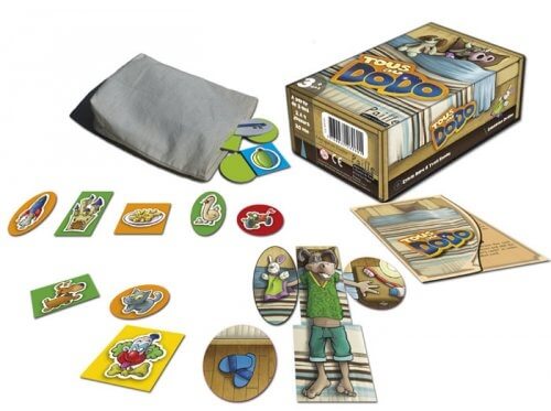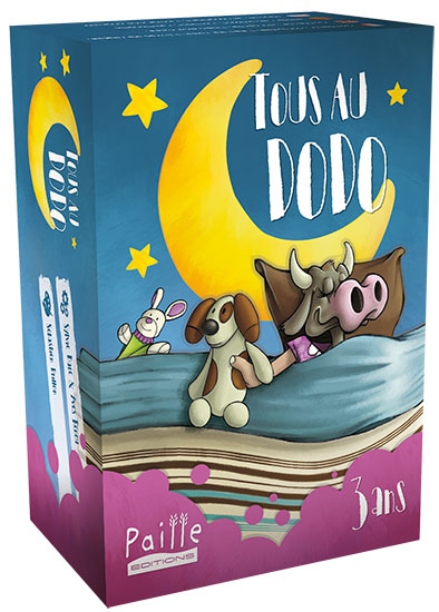 Tous au dodo est un jeu annoncé à partir de 3 ans et non seulement c’est une vraie réussite à 3 ans, c’est aussi un plaisir à jouer en tant qu’adulte. Le thème est enfantin : on se prépare pour le dodo et quand tout est prêt : hop, une histoire. Le jeu est donc en deux parties. Dans la première, c’est un jeu de pioche où on essaie de reconstituer chacun-e un petit puzzle : haut et bas de pyjama, brosse à dents, chaussons et doudou. Avec deux particularités très sympathiques : on pioche dans un sac en aveugle en essayant de reconnaitre avec les doigts les formes qu’il nous faut ce qui marche bien pour les petits et n’est pas si évident pour les grands (la reconnaissance tactile : un mécanisme trop rare que j’aime beaucoup); et certaines tuiles sont des illustrations colorées qui ne font pas partie des puzzles et qu’on aligne au milieu de la table pour la seconde partie. Dans celle-ci, une fois prêt-es pour le dodo, on va inventer une histoire avec la série d’illustrations au milieu de la table. Et ça c’est un vrai bonheur, surtout pour un papa rôliste et une petite fille qui ne se lasse jamais des histoires (et qui commence vraiment à contribuer dans ce genre de format). Tout ça fait vraiment un joli jeu, simple mais très efficace et avec des mécanismes malins qui changent des classiques du genre. Pour nous, c’est un grand succès, Olympe demande à rejouer à chaque fois.