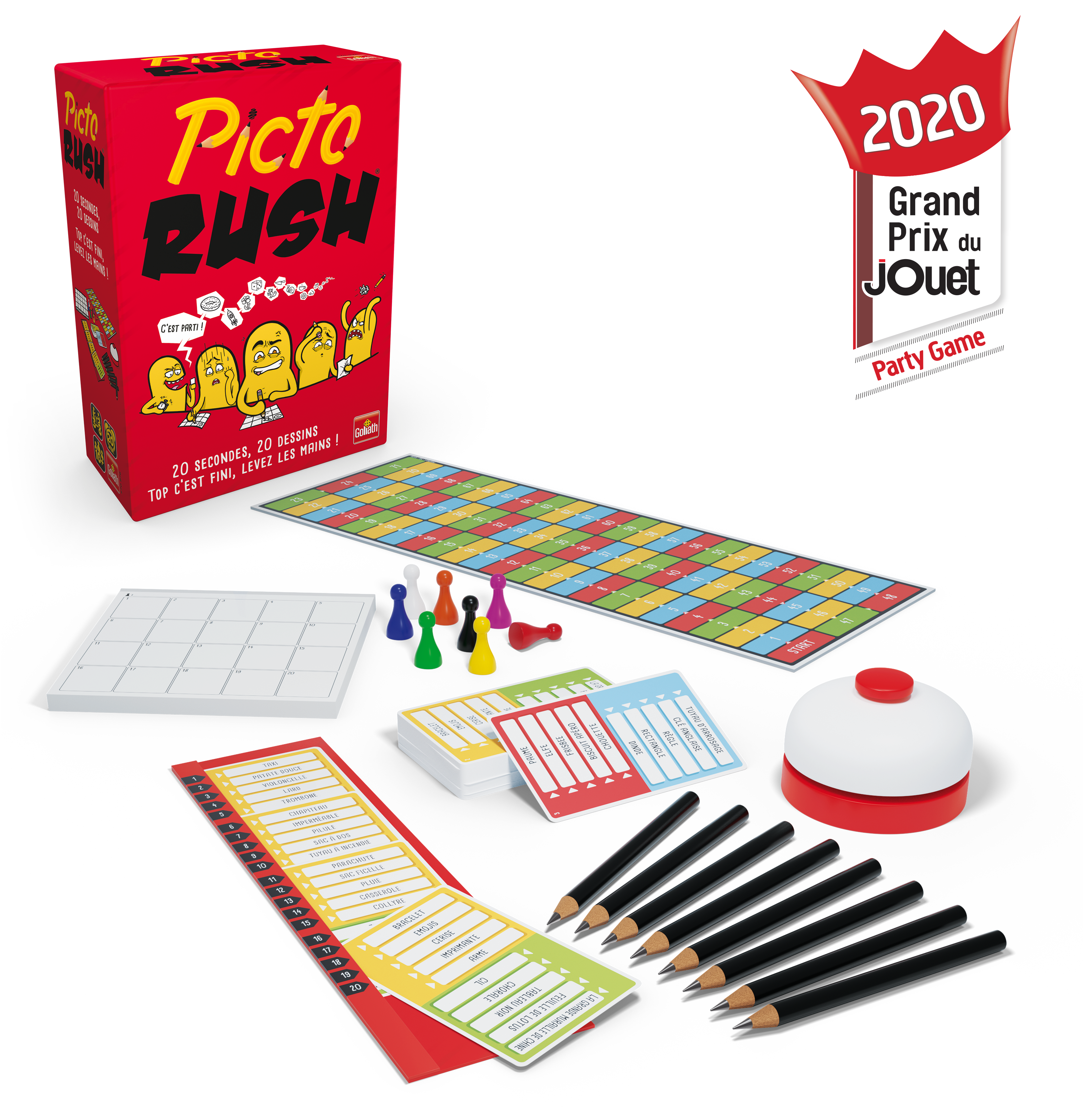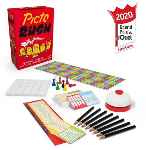 Picto Rush est un jeu de dessin mais en fait non. C’est encore moins un jeu de dessin que la moyenne : c’est un jeu de rapidité, de gribouillage malin et de mémoire. Une personne lit aux autres vingt mots en plus ou moins vingt secondes et chacun-e doit gribouiller au même rythme dans vingt petites cases des pictos à l’arrache. Sans enjeux esthétiques ni même de crédibilité – juste pour se souvenir soi ce dont il s’agit. Ce qui demande donc d’être malin avec soi-même bien plus que de savoir dessiner. Puisqu’après il y a interro sur des numéros au hasard pour marquer des points (en mode rapide aussi pour garder le rythme). C’est donc un jeu très rapide et franchement rigolo dans lequel on peut facilement se foutre de vraiment compter les points, ce qui est toujours bon signe de mon point de vue. Je ne pense pas qu’on puisse y jouer très longtemps d’affilée mais c’est franchement drôle, ça ne met pas grand monde en difficulté puisqu’on dessine pour soi sans forcément montrer aux autres et la durée de jeu s’ajuste très facilement. Très bien pour de l’animation courte ou pour un petit moment de déconne qui réveille.