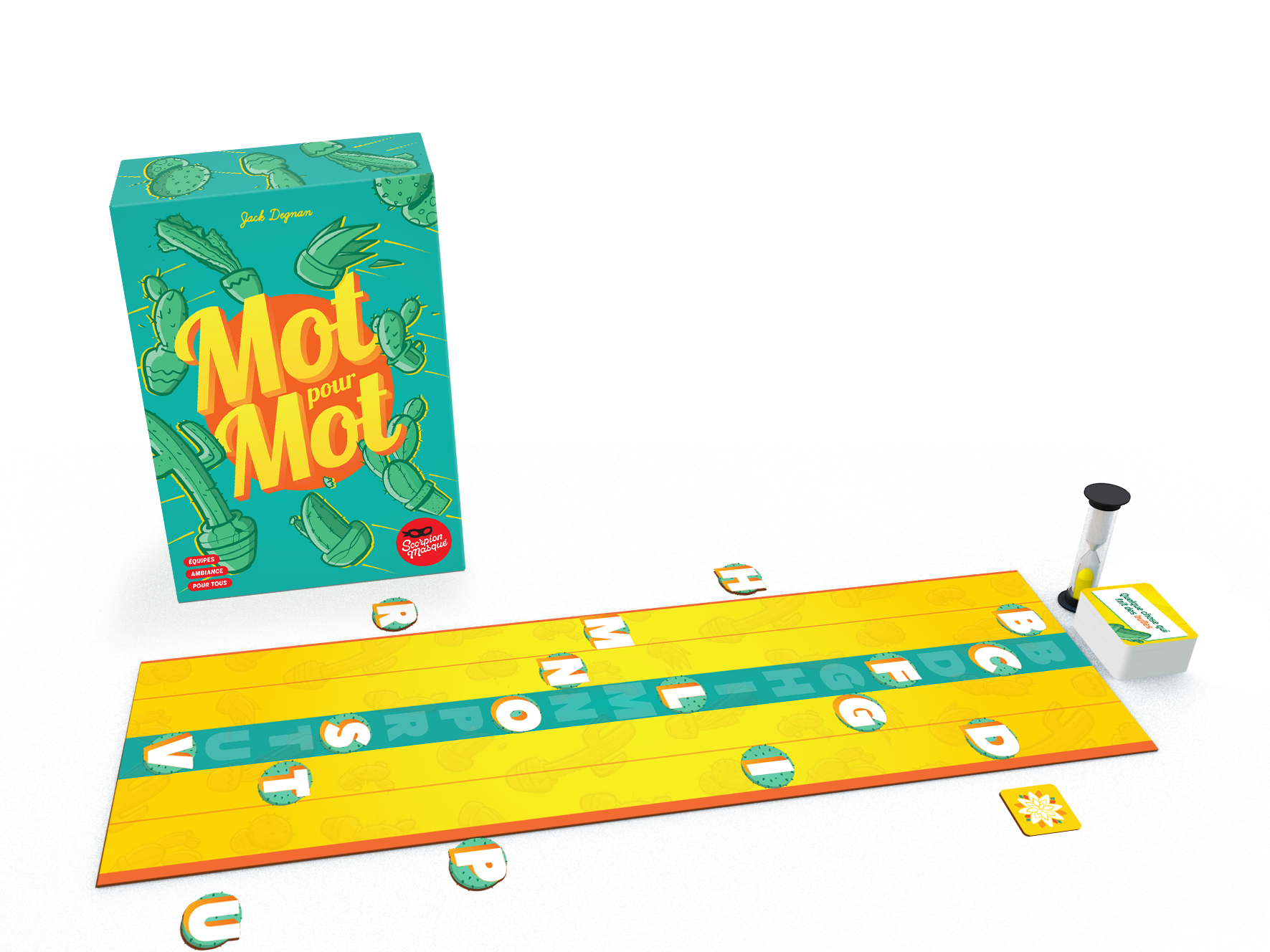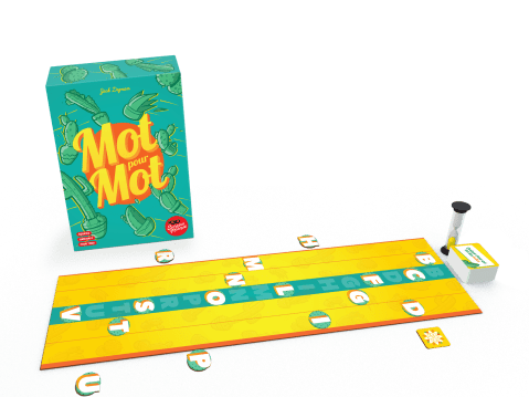 Mot pour mot est un jeu de lettres, sans surprise vu le titre, qui en est à sa seconde édition (ce qui a été l’occasion d’ajustements mineurs mais bienvenus). Ça se joue à deux équipes, face à face, séparées par une série de lettres. Au tour de votre équipe, vous piochez un thème et vous avez trente secondes pour : vous mettre d’accord sur un mot (dans le thème), l’épeler et faire avancer chaque lettre du mot (quand une lettre a été avancée trois fois, elle est gagnée (et à cinq lettres gagnées, c’est la victoire)). Donc : ça va vite, ce que je trouve plaisant dans un jeu de lettres. Et : ça suppose des stratégies inhabituelles. plutôt des grands mots, mais pas avec n’importe quelles lettres et si possible en double ou en triple. C’est assez original pour renouveler les formats classiques tout en restant rapidement compréhensible et accessible. Et comme les parties sont tendues et rapides, on en remet bien volontiers une seconde puis une troiisème. Après, j’ai quand même un vrai bémol : c’est chouette et rigolo d’avoir tout et n’importe quoi comme thème mais dans certains cas on ne comprend pas l’intitulé (ou bien il fait plus interro scolaire qu’autre chose) et ça casse un peu la dynamique de jeu (c’est ponctuellement lié au fait que c’est du québécois mais pas que). A ceci près, c’est un très bon jeu, à tester si l’association jeu de lettres et party game vous séduit.