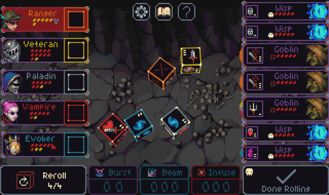 Je trouve plus souvent mon bonheur, en termes de jeux vidéos, dans des petites productions aux graphismes à l’ancienne (et là, la nostalgie doit jouer) et aux mécanismes efficaces et lisibles (ce qui fait certainement écho à ma culture du jeu de plateau). Slice and dice fonctionne exactement sur ces bases : des pixels qui se voient, du combat tactique et calculable avec pleins de dés et de pouvoirs, et une logique générale de rogue-like. Tout ceci avec une clarté et une ergonomie remarquables. On démarre avec cinq personnages niveau 1, chacun ayant un dé sur lequel se trouve l’ensemble de ses compétences. On lance les dés, jusqu’à trois fois, pour sélectionner les faces le mieux possible et, pif paf, on tabasse les monstres en face. Qui ripostent et le cas échéant on gagne des niveaux et quelques bonus qui permettent de peaufiner ses choix stratégiques. Et on enchaîne sur vingt niveaux en croisant les doigts (il y a des dés donc du hasard) et en calculant (ça reste simple mais tactique). Au fil des réussites, on débloque modes de jeux, bonus et options Une partie menée au bout, c’est autour d’une heure. Autant dire qu’il y a de quoi s’occuper et que c’est gentiment addictif. Ça finira par me lasser mais ça va me prendre un certain nombre d’heures (merci Mael !). Essayez la démo, ça donne une bonne idée des bases et ensuite si vous aimez, c’est pas ruineux et sans achats cachés ensuite.