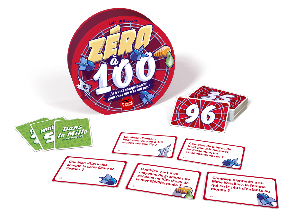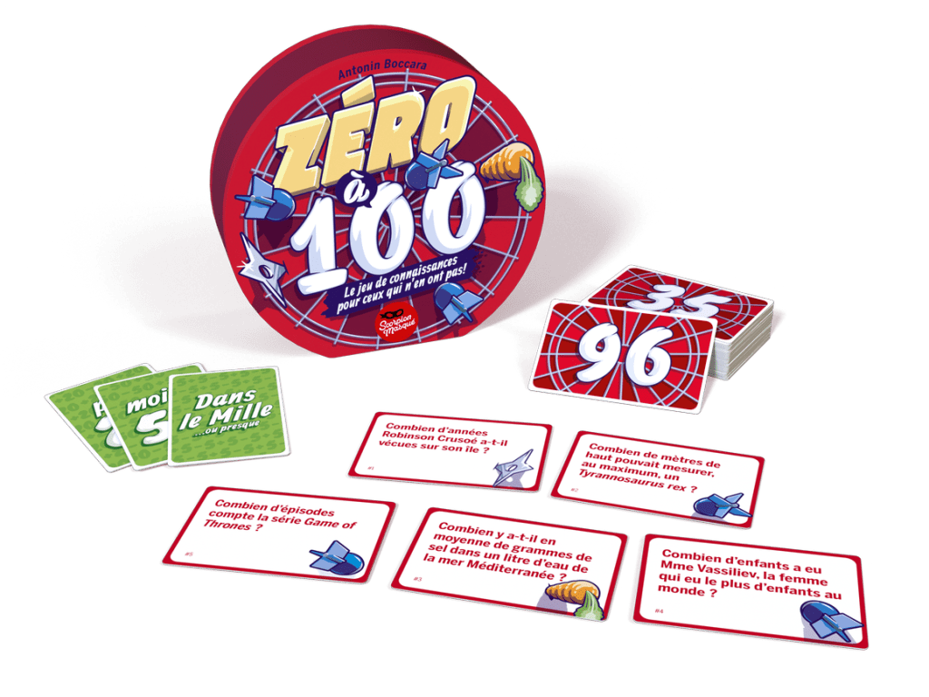 J’aime bien les petits jeux de connaissance qui n’en sont pas vraiment, et Zéro à cent s’inscrit tout à fait dans cette famille (avec Quitte ou double, Le giraffomètre, voire Pigeon pigeon et Timeline). Ici, trois équipes (ou deux) vont à chaque tour tenter de choisir parmi leurs cartes (chacune avec une question concernant tout et surtout n’importe quoi) celle dont la réponse est la plus proche du chiffre cible. C’est simple, c’est efficace et ça permet de débattre de nos représentations sur des thèmes absurdes. Ce qui donne une ambiance de jeu détendue et plutôt tranquille (enfin, selon à quel point vous aimez gagner, forcément) de discussion et d’interrogations. S’ajoutent à ça trois bouts de règles bien pensées et simples
