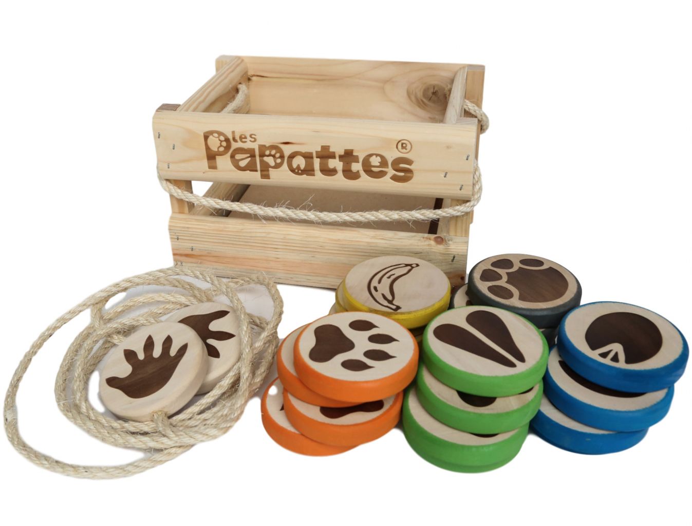 Les papattes, c’est une variation sur les jeux de lancer de palets traditionnels. Avec un matériel plus facilement transportable, plus attirant pour les enfants et des règles astucieuses et efficaces. On délimite le terrain avec une corde lestée : au-delà, c’est la rivière, faut pas y aller. Ensuite, chacun-e va lancer ses quatre palets (agréablement décorés d’une empreinte de papatte, donc) en essayant de lancer chaque palet plus loin que le précédent mais sans tomber dans la rivière. Ce qui n’est pas trop difficile, donc c’est bien pour les enfants, mais susceptible de tactique et d’adresse, donc c’est cool aussi pour les adultes. Ensuite, une phase où on lance les palets bananes pour pourrir la vie des adversaires et on peut enfin compter les points, avec assez de critères pour justifier de la tactique. Je trouve l’ensemble très réussi. On y retrouve le plaisir des jeux de lancer (palets, molkky et autres), et dans une version qui fonctionne aussi bien pour les grand-es que pour les petit-es, et surtout avec les deux à la fois. Avec qui plus est un matériel sympathique et attirant (mon seul bémol étant le poids et le volume de la caisse de rangement/transport, mais bon, c’est comme pour certains molkky : si vous n’êtes pas en voiture, vous pouvez le jeter dans un sac). Une chouette découverte qui resservira sûrement (merci Jb et Crystèle).