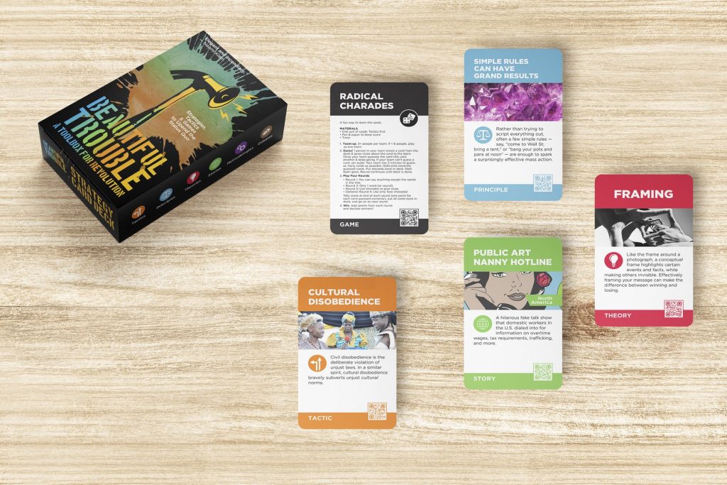 Beautiful trouble, en français Joyeux Bordel, c’ est un bouquin de méthodes, théories et outil pour changer le monde (faire la révolution ?) et c’est une vraie référence pour moi (dans mon boulot mais pas que). TESA, c’est un collectif qui fait des jeux sur la transformation et la lutte sociale. Et donc, ici, le contenu du livre Beautiful Trouble en format jeu de cartes. Le contenu se prête vraiment bien au jeu puisque c’est une collection de trucs. Ils sont ici très bien et très joliment résumés en une carte chacune, avec une icône et un code couleur pour distinguer principes, théories, exemples, outils, etc. Rien que ça, déjà, c’est trop bien pour feuilleter, se remettre en tête, découvrir. En plus de ça, il est proposé un certain nombre de manières de manipuler cartes et contenus (des règles de jeu donc, même si j’ai tendance à dire que ce ne sont pas vraiment des jeux) pour prendre du recul sur ce qu’on fait, planifier, évaluer ou inventer des dispositifs. Ce qui est une manière de faire riche et qui me va très bien (et que je pratique d’ailleurs avec d’autres supports). Le seul reproche que je peux faire à ce paquet de cartes, c’est de n’exister pour l’instant qu’en anglais Pour le reste, c’est vraiment tout bon.