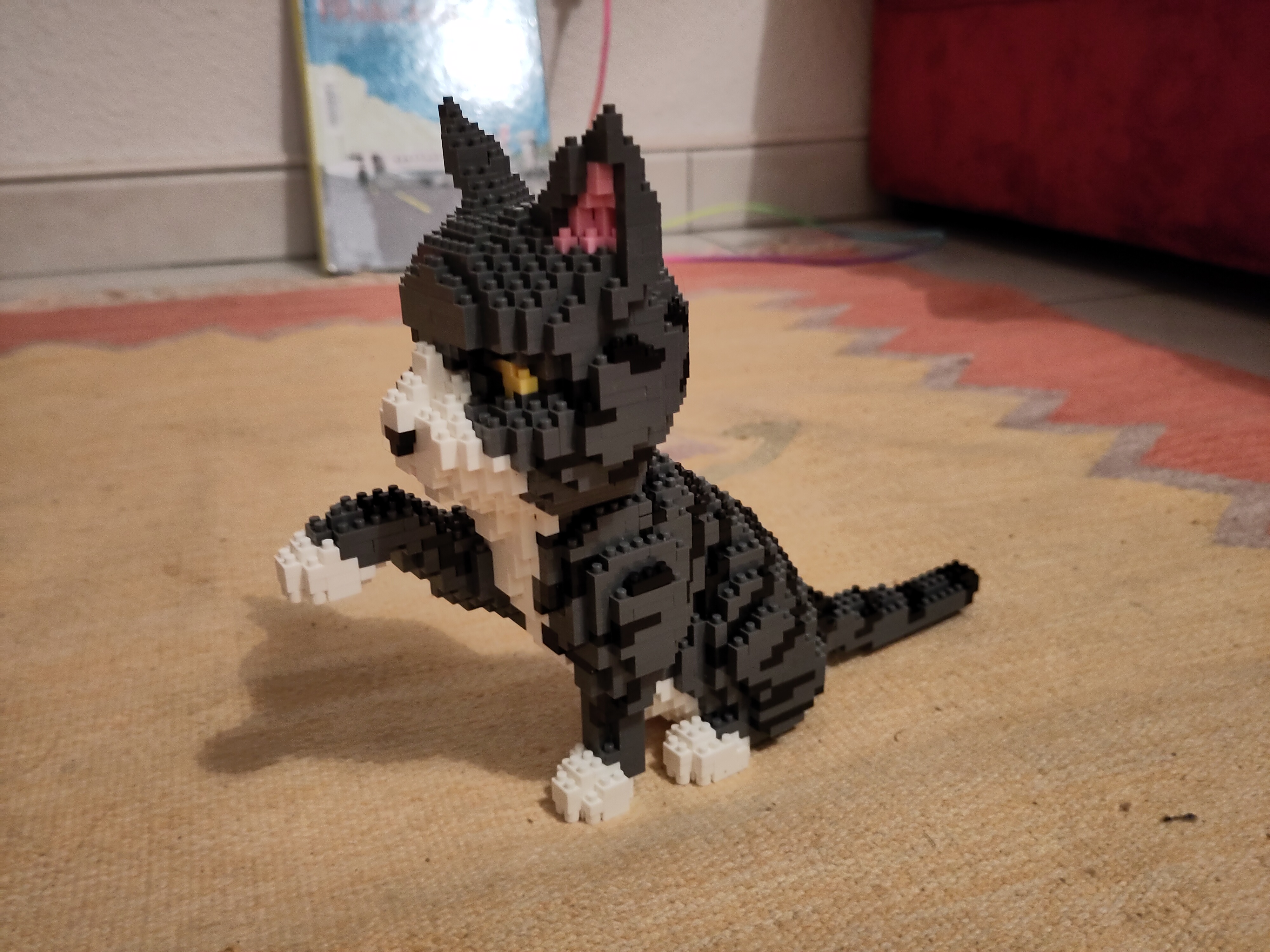 Les nanoblocks, c’est comme des Legos, mais en beeeaucoup plus petit. Les plus petites pièces sont vraiment minuscules (ce qui veut dire que ça se manie avec un éclairage raisonnable et surtout sur un plateau ou équivalent (n’en renversez pas dans les plis d’un canapé, voire de vos vêtements, vous risquez de ne pas les retrouver)). Du coup, plus encore que les Legos, l’idée est de reconstituer le modèle prévu. Dans mon cas, c’est un chaton qui m’a été offert pour Noël (merci Elliot et Fanny). Le gros avantage des toutes petites pièces, c’est qu’on peut faire des choses vraiment élaborées en restant dans un volume décent. Et ça rend vraiment en termes de détails et de formes (ça ne fait pas cubique). L’autre avantage, lié, est que pour qui aime monter des Legos : vous en aurez pour votre argent (ce chat est en 76 couches superposées). À l’inverse, deux inconvénients (de vieux) : ça fait mal aux doigts (si, si, sérieusement, sur la longueur j’avais vraiment le bout des doigts meurtri) et surtout aux yeux. En fait le manuel est imprimé petit avec une seule illustration par couche : pour le côté puzzle c’est sympa mais par contre j’ai dû photographier et zoomer à chaque fois sinon je ne vois pas les formes des pièces (grises à 80 %, ça n’aide en rien). En termes d’ergonomie, c’est donc assez limite (les fans diront : c’est exigeant). Je me suis amusé mais je ne crois pas que j’aurais le courage de remettre ça. Ce qui est regrettable parce que le résultat est vraiment chouette (et a été adopté immédiatement comme animal domestique).
