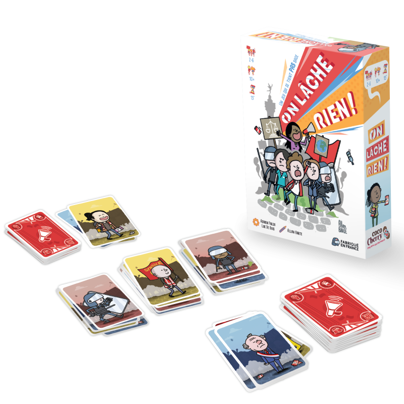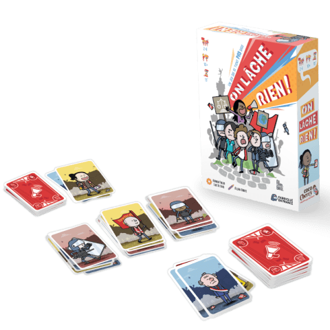 On lache rien est un tout petit jeu édité avec la Ligue des Droits de l’Homme et l’Association des chrétiens pour l’abolition de la torture. On aurait pu craindre un énième jeu pédagogique lourdaud et maladroit, et bien pas du tout. Le principe de jeu est ultra simple, une base de jeu de rapidité dans lequel il faut taper rapidement lorsque certaines configurations de cartes apparaissent (et comme il y a trois sortes de cartes et trois configurations concernées, c’est vraiment simple à expliquer et à jouer). En termes de jeu, donc, ça fonctionne, c’est un petit jeu de rapidité en mode apéro pas prise de tête. Sans aucune profondeur, bien sur, mais quand on rajoute les cartes optionnelles, ça prends un tout petit plus de chair tout de même. Quel intérêt me direz-vous, c’est pas comme si ça manquait de jeux de ce type ? L’intérêt, c’est que les configurations pour taper sont tout sauf neutres : On lache rien ! Tous pourris, et Violences policières. Si c’est pas déjà une excuse pour discuter, je ne sais pas ce qu’il vous manque. Et surtout, partant de là : il y a un livret d’accompagnement, en plus du livret de règles. Livret qui est un lexique synthétique, clair et très pédagogique autour du droit à manifester, des pratiques et violences policières et du cadre juridique. Une ressource vraiment bien foutue et vers laquelle on glisse très naturellement à partir du jeu. C’est un choix que je trouve malin de garder un jeu simple et drôle qui fait passerelle vers un contenu pédagogique affiché comme tel. Pour vos soirées entre islamo-gauchistes, vos temps syndicaux ou d’éducation populaire politique, ça fait un mini-jeu avec du contenu derrière, et en plus, ça finance les deux associations en question.