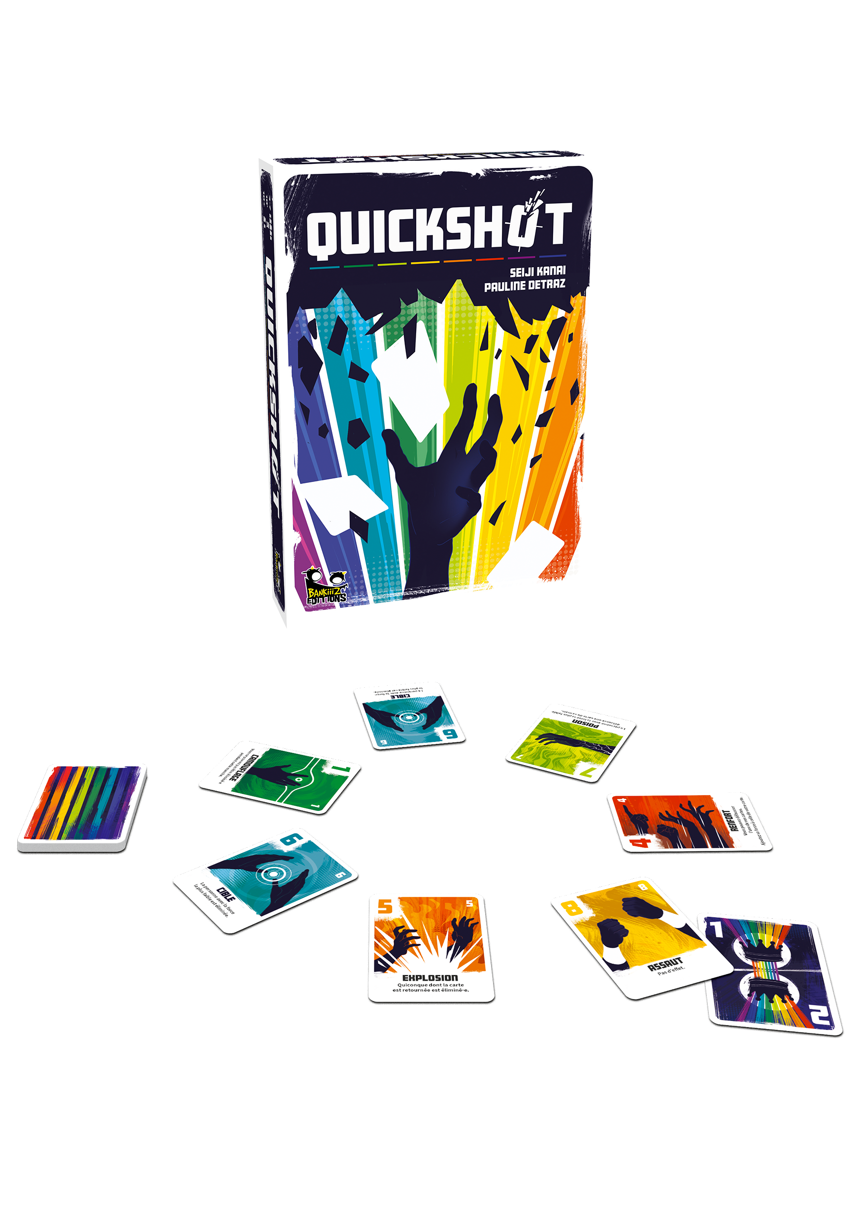 Seiji Kanai fait partie de mes auteurs de jeu de référence uniquement parce qu’il est responsable de Love Letter, qui est tout de même un classique incontournable. Avec Quickshot, on est exactement dans la même veine. Des cartes-rôles, des éliminations rapides et brutales, des mécanismes qui s’imbriquent et se répondent intelligemment et des parties très courtes. Oui, vraiment très courtes, puisque c’est quatre manches maximum, et que chaque manche c’est : chacun-e joue une carte, en même temps, et on applique les effets des cartes. Une logique de Battle Royale, brutale. Mais les règles sont remarquablement simples : huit rôles, dont seulement sept ont un pouvoir, qui tient en une phrase. A partir de là, on est sur un terrain de bluff et contre-bluff, très teinté de hasard. Enfin, à cinq, il y a bien moins de hasard, mais à moins, si, ce qui change un peu l’ambiance de jeu. Pas forcément mal, notez. Et dans les deux cas, je trouve que ça fonctionne tout à fait bien. On retrouve vraiment le format de Love Letter, en plus rodé et brutal (et sans l’effet de nouveauté). Je ne suis clairement pas déçu, mais je pense que ça prend toute sa mesure en rejouant suffisamment avec les mêmes personnes, ou en tout cas avec des personnes qui connaissent un peu.