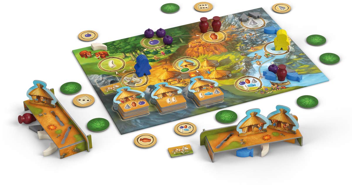 Presque six ans : on peut commencer les jeux un peu plus élaborés, les premiers jeux de règles, et ça me fait franchement plaisir. L’age de pierre, en version adulte, est un classique incontournable, alors qu’en est-il de sa version junior ? Franchement, c’est très réussi comme adaptation. D’abord, c’est tout à fait fidèle, en termes de thèmes mais aussi en termes de mécanismes. On cherche également à construire des huttes, ce qui demande des ressources variées, et on collecte les ressources en se promenant dans les différents lieux du paysage (carrière, rivière, prairie des mammouths, etc). Le système de déplacement est un mémory, avec quelques variations, ce qui fonctionne très bien et est vite compris et laisse la place à la gestion de ressources, et au plaisir d’aller récupérer le chien le plus souvent possible (c’est le joker). Pour une enfant de 5-6 ans, ça fonctionne très bien, c’est vite compris et c’est immersif (grace notamment à un matériel impeccable). Et pour un adulte, ben ça marche aussi. Non que ça demande une réflexion profonde, mais il y a de quoi y trouver un vrai intérêt et avoir des bouts de priorités et de stratégie, et donc de jouer vraiment, pas seulement de faire jouer. C’est accessoirement un jeu qui fonctionne tout à fait bien à deux, et bien sûr à trois ou quatre. Franchement, pour une entrée dans les jeux de plateau avec de vraies règles, c’est une belle réussite.