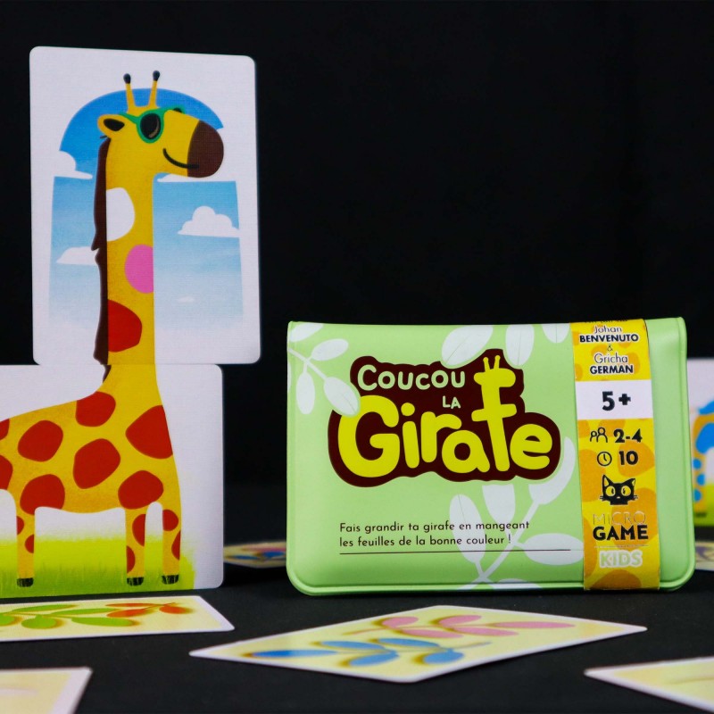 Un micro-jeu, mais cette fois-ci avec une pochette d’une couleur plus rigolote, et avec une girafe dessus. Toujours un nombre de cartes très limité, et un principe engageant : faire grandir le cou de sa girafe le plus possible. Pour ça, il faut lui donner à manger et les girafes sont difficiles. Le mécanisme semble au départ être de l’observation, sauf que… pas seulement. Comme c’est aussi de la rapidité, on n’a pas forcément intérêt à attendre d’avoir tout vu, on peut choisir de prendre des risques et de choisir avant d’avoir toutes les infos. Il va falloir choisir entre les deux. Ce qui est un dilemme qui permet de mélanger des ages différents avec chacun-e ses stratégies de préférence. Et ça permet aussi d’avoir une vraie tension quand on joue entre adultes. Oui, ça marche bien. Pour des parties très courtes, forcément, mais dynamiques. Et avec un matériel qui est très mignon et coloré. Moi, je l’ai adopté pour les moments sans efforts.