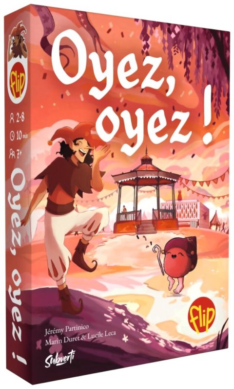 Oyez oyez est un petit jeu publié à l’occasion du FLIP (le festival ludique international de Parthenay, un des très gros événements ludiques français). Il s’agit d’un jeu de mémoire et d’observation simple et mignon. On révèle des cartes une à une, chacune recouvrant la précédente. Après chaque nouvelle carte, il faut dire le nombre de tel paysage ou de tel personnage présents dans l’ensemble de la pile de cartes révélées. Avec une logique de bluff et de défi. C’est tout simple et c’est tout à fait efficace. Avec qui plus est des cartes de grand format, ce qui est agréable pour jouer en grand groupe sans forcément se coller sur le paquet de cartes. Rien de particulièrement nouveau ou notable, mais de l’efficace notamment pour des temps courts et mélangés.
